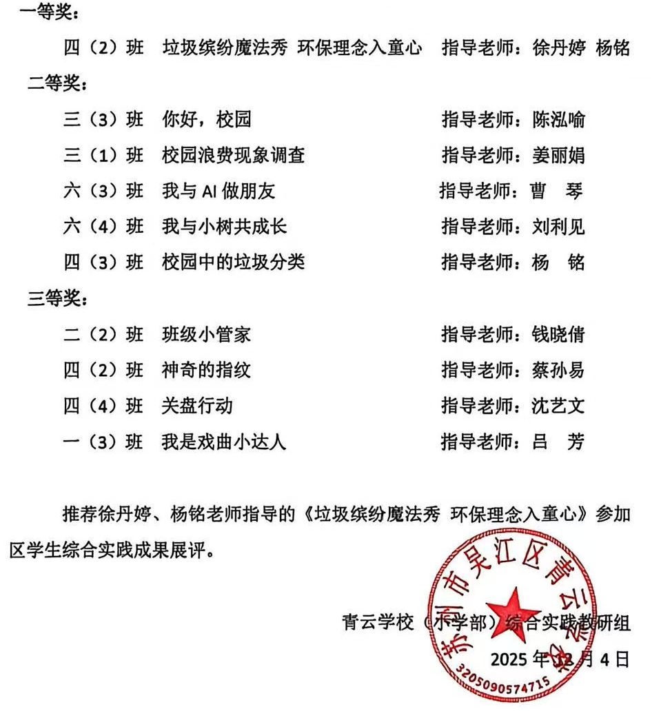12月4日,我校在四楼多功能教室开展了2025--2026学年第一学期综合实践活动成果展评,经评委认真评选,结果如下:
