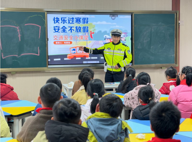为增强学生假期交通安全意识,筑牢寒假出行安全防线,1月26日上午,桃源镇交通警察中队的警官们走进我校,为同学们带来了一堂生动有趣、干货满满的“快乐过寒假,安全不放假”交通安全知识小课堂。